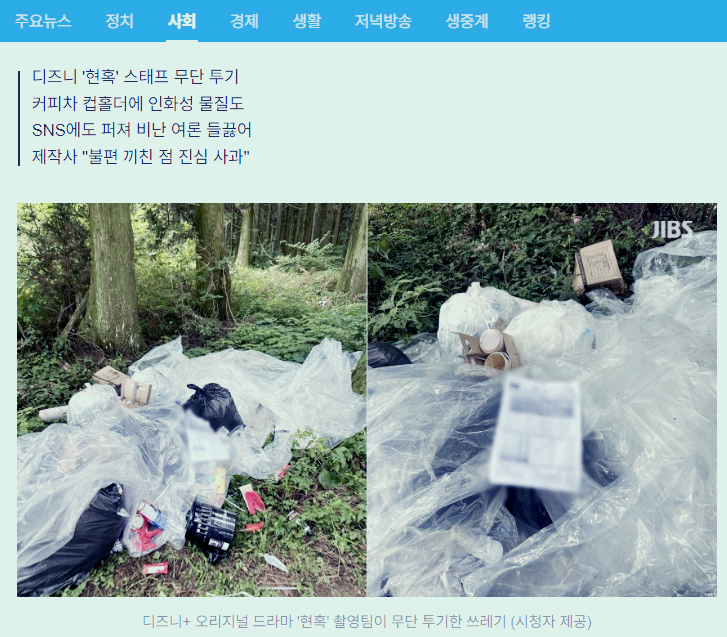 논란이 커지자 드라마 '현혹'의 제작사인 '쇼박스' 측은 공식 입장을 밝혔어요. 제작사 관계자는 "촬영이 늦게 끝나 어둡다 보니 꼼꼼하게 현장 마무리를 하지 못했다"며 "촬영장과 유관 기관에 사과와 양해를 구했고, 바로 쓰레기를 정리해 현재는 모두 정리된 상태"라고 전했죠.