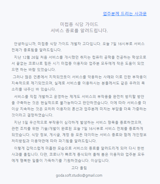 결국, <미접종 식당 가이드>는 2022년 1월 7일부로 종료하게 되었습니다. 아래는 미접종 식당 가이드에 올라온 개발자의 서비스 종료 안내문입니다.