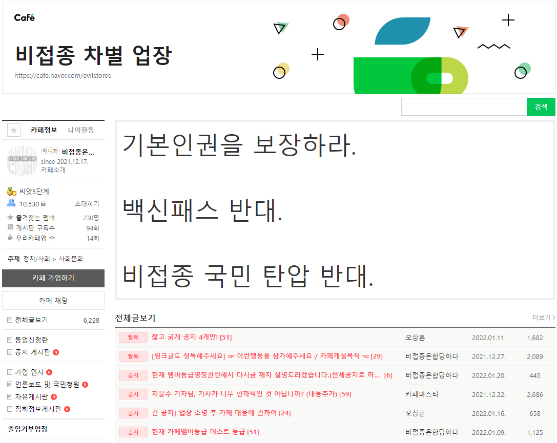 현재 1만명의 회원을 돌파중인 네이버 <비접종 차별 업장>이 당분간 <미접종 식당 가이드>를 대신할 수 있을 것으로 보이니 참조하시면 좋을 듯 합니다.