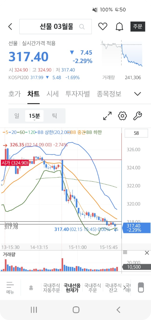 - 일봉과 15분봉, 이동평균선과 볼린저밴드만 참조하며, 거래량 지표는 무시합니다.